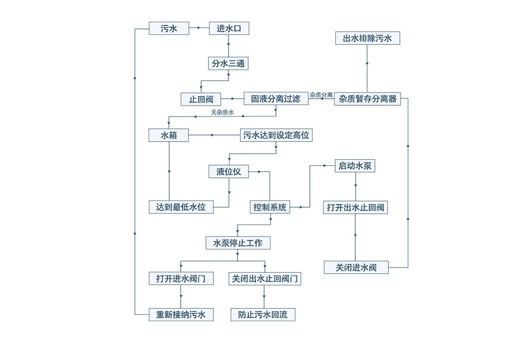 采用雜物污水分離器結(jié)構(gòu),使水泵與可纏繞型雜物不接觸,避免雜物纏繞堵塞水泵葉輪好而燒壞水泵電機;具有反沖洗功能,使得設(shè)備內(nèi)不會產(chǎn)生沉淀,實現(xiàn)了無沉淀,免清掏,大大節(jié)約了設(shè)備運行和管理維護的成本。